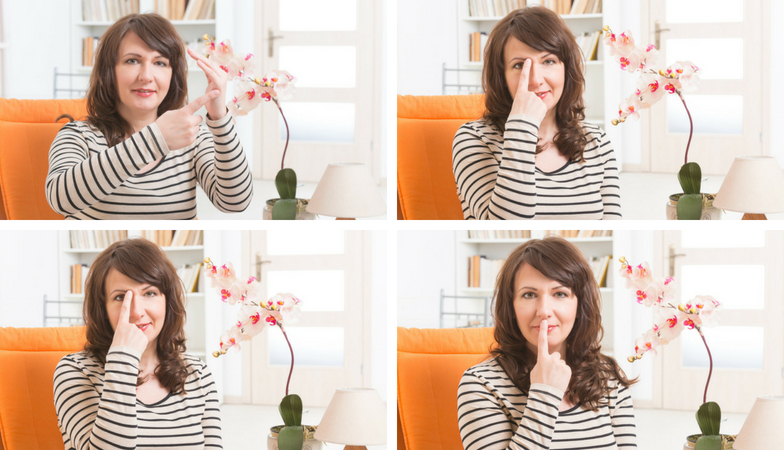 * place your fingers in the centre of your forehead and draw the fingertips repeatedly to the sides of the face, smoothing the brows