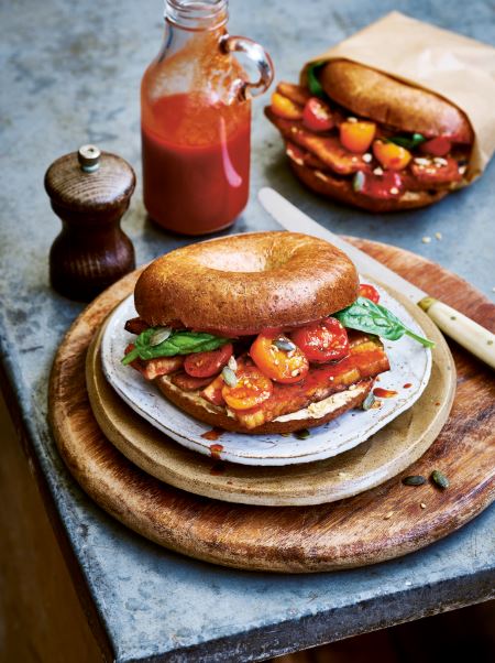 5. Serve the tempeh bacon in toasted wholemeal bagels with the blistered tomatoes, some fresh spinach, vegan cream cheese, ketchup and a sprinkling of mixed seeds.