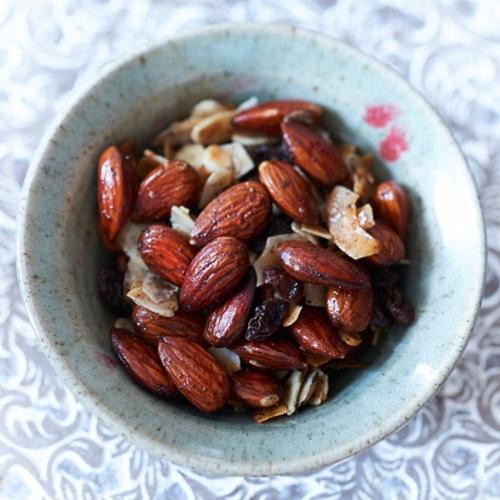 ‘For lunch I tend to eat leftovers, I’m always recipe testing so I tend to enjoy whatever is left in the fridge’, Woodward says. ‘I’m a big snacker too’, says Woodward. ‘I love things like homemade trail mix with almonds, raisins, coconut and vanilla it’s so delicious’, Woodward admits. ‘The almonds add a great crunch, whilst the other ingredients add a lovely sweetness’, she says. ‘For dinner, I love big warming bowls of things like creamy veggie curries with coconut and spices with brown rice,’ Woodward reveals.